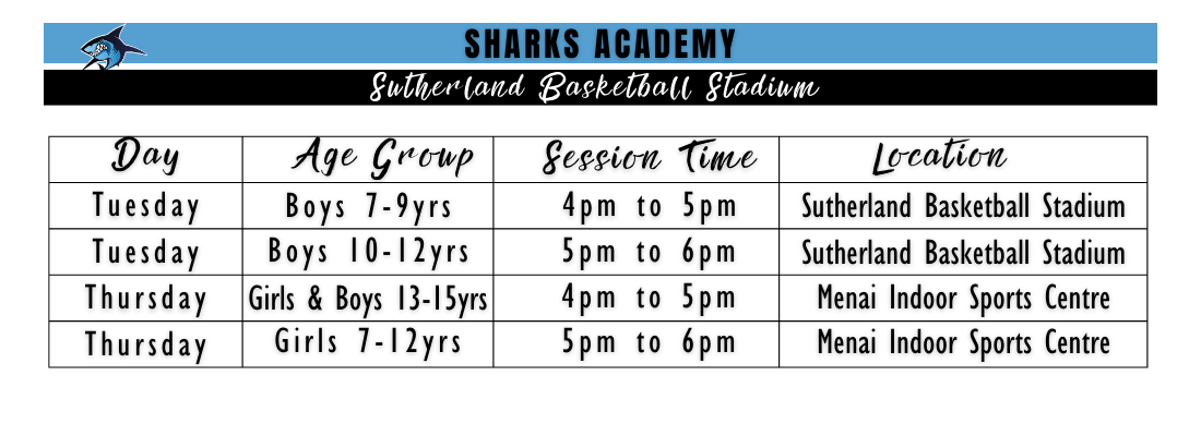 The Sharks Academy Program is a specially designed initiative for young basketball enthusiasts who have been identified as having significant potential and enthusiasm in the sport that the club believes they could play representative basketball in the future.